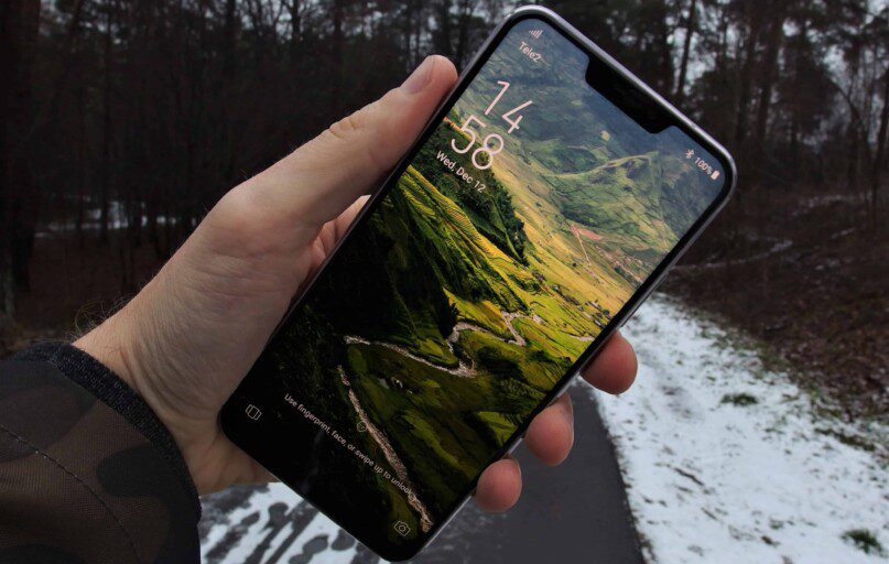 Visų pirma, šis telefono ekranas yra didesnis už pamėgdžioto „iPhone X“ – tai ryškus, puikiai perteikiantis spalvas 6,2 colių įstrižainės IPS LCD ekranas, kurio skiriamoji geba 2246 x 1080 pikselių (FHD+), o kraštinių santykis 18,7:9. Dėl dirbtiniam intelektui patikėto automatinio spalvų koregavimo pagal besikeičiančią aplinką (kažkas panašaus į Apple naudojamą „TrueTone“ technologiją), spalvų gama puikiai subalansuojama ir vaizdas nesuliejamas. Vis gi, tai IPS matrica ir juoda spalva čia ne tokia gili, kaip AMOLED ekranuose, ji pastebimai turi tamsiai pilką atspalvį, o tai kartais erzina. Taip pat nepatogumų sukelia, ypač žaidimuose, šalia kraštų suprastėjęs lietimui reagavimas. Daugumai nepatinka ekrano išpjova, tad ją lengvai galima programiškai paslėpti, bet žvitri akis vis tiek ją pastebės dėl jau minėtos pilkuojančios juodos spalvos. Labai maloniai nustebino galimybė įsijungti naudojimosi su pirštinėmis funkciją, kurią net ne visi flagmanai turi. Naudojantis telefonu lauke ji tikrai pravers, juo labiau, kad ekranas puikiai įžiūrimas tiesioginėje saulės šviesoje, o apžvalgos kampai ganėtinai dideli.
