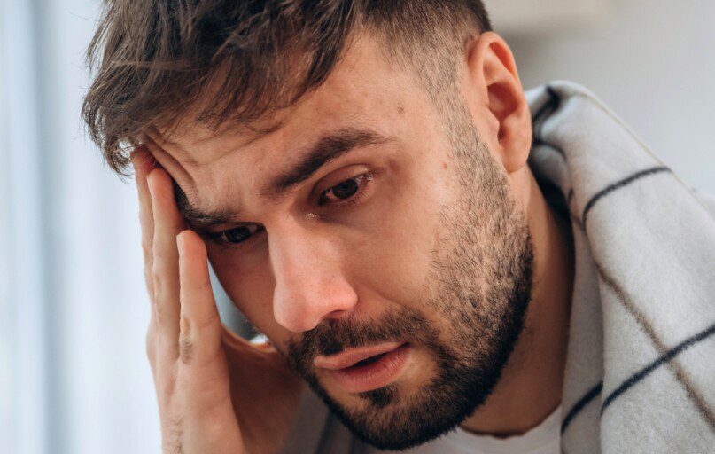 man sitting on chair covering his eyes
