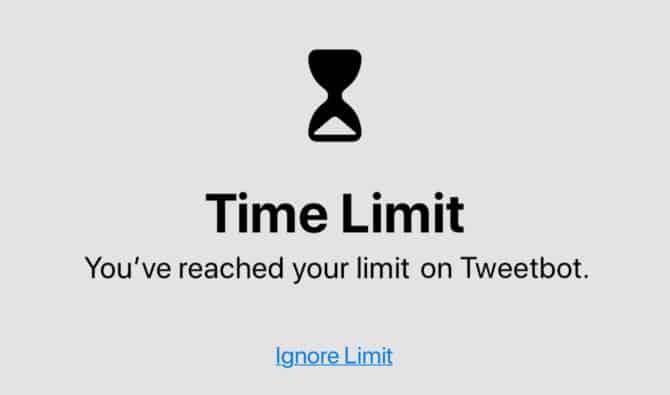 Kai „Screen Time“ nurodytas laikas išseks nurodytoje kategorijoje (pavyzdžiui socialiniuose tinkluose) — socialinių tinklų aplikacijos nepasileis ir naršyklėje neatsidarys su socialiniais tinklais susijusios svetainės. Reikia tikėtis susivaldysite ir desperatiškai negremšite stalo laukdami vidurnakčio visomis išgalėmis stengdamiesi nepaspausti „Ignore Limit“ mygtuko.