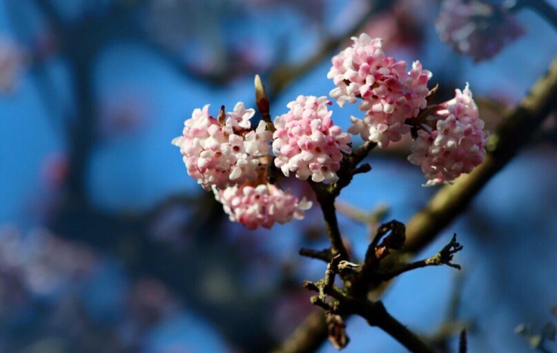 Žydėjimo laikas priklauso nuo oro sąlygų: švelniomis žiemomis krūmas gali pradėti žydėti jau gruodį, dažniau – nuo sausio iki balandžio. Pumpurai būna tamsiai rožiniai, o prasiskleidę žiedai – balti arba balti su švelniu rožiniu atspalviu. Žiedai susitelkę į rutuliškus ar šluotelės pavidalo žiedynus, kurių skersmuo siekia 3–5 cm. Aromatas intensyvus, saldus, primenantis prabangių kvepalų natą su hiacinto ir vanilės užuominomis.