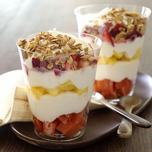Jums reikės: lieso jogurto, medaus, vanilės ekstrakto, braškių, papajos ir ananaso gabaliukų, dribsnių.