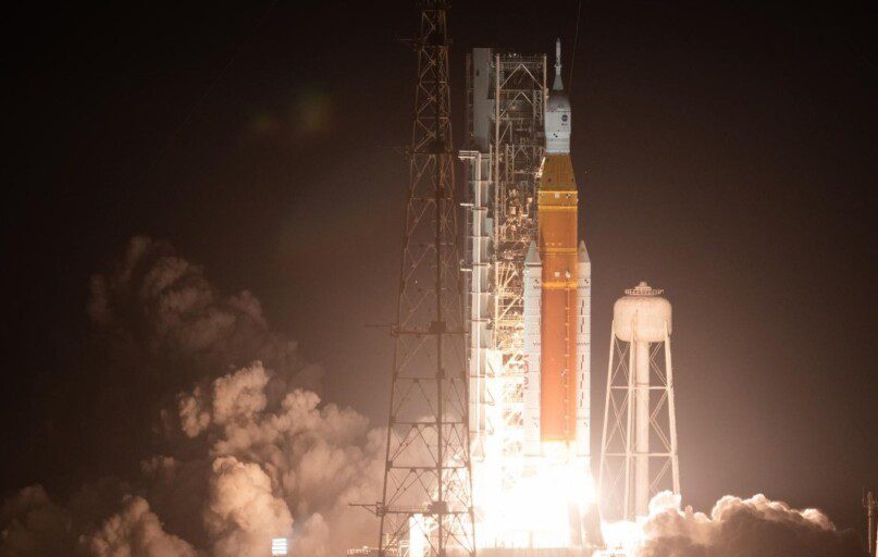 Pirmasis SLS pakilimas įvyko 2022 m. lapkričio 16 d., ir jis taip pat buvo kelis kartus atidėtas dėl techninių nesklandumų bei oro sąlygų. Milžiniška raketa galiausiai sėkmingai pakilo ir iškėlė į orbitą naują, žmonėms skirtą kapsulę Orion – šįkart dar be įgulos. Orion tada nuskrido prie Mėnulio, atliko numatytą programą ir grįžo į Žemę.