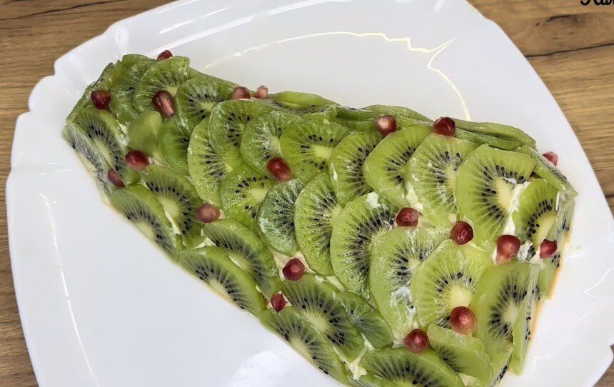 Pabaigoje dar kartą užtepkite majonezo ir išdėliokite plonais pusmėnuliais supjaustytą kivį taip, kad jis visiškai uždengtų viršutinį sluoksnį ir dar labiau išryškėtų eglutės forma.