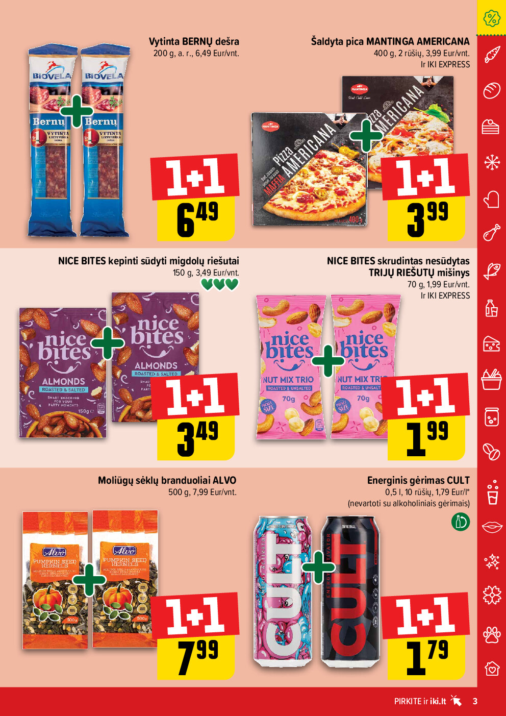 Jeigu tikslas – maksimaliai išnaudoti didžiausias nuolaidas, praktiškiausia dairytis „1+1“ pasiūlymų, nes būtent jie suteikia didžiausią procentinį sutaupymą perkant porą. Iš viso leidinio ypač išsiskiria keli variantai su aiškiai nurodytomis kainomis: vytinta dešra „FUET IMPERIAL“ (3,69 Eur), virta KREKENAVOS dešra (2,99 Eur), šaldyta pica „MANTINGA AMERICANA“ (3,99 Eur), negazuotas mineralinis vanduo „TICHĖ“ (1,65 Eur) ir spanguolių nektaras „CIDO EXCLUSIVE“ (2,99 Eur) – visiems jiems taikomas „1+1“ formatas, todėl antras vienetas pridedamas nemokamai.