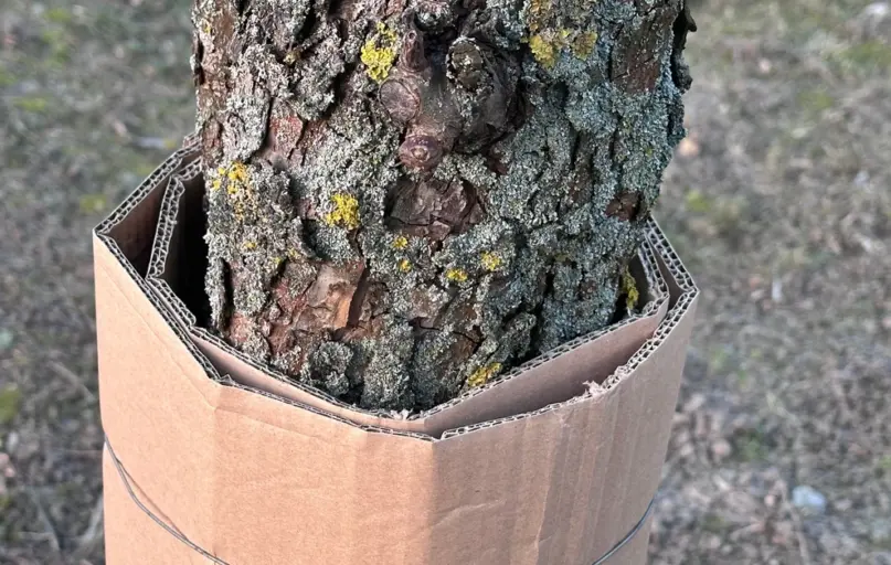 Kartoną apvyniokite aplink medžio kamieną du kartus. Dažniausiai juosta dedama maždaug 50–60 cm aukštyje nuo žemės.