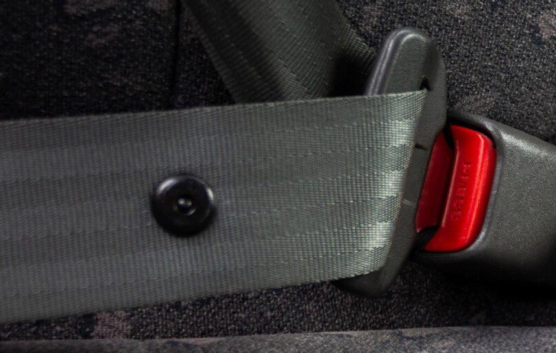 Kam skirtas juodas mygtukas ant saugos diržo?
