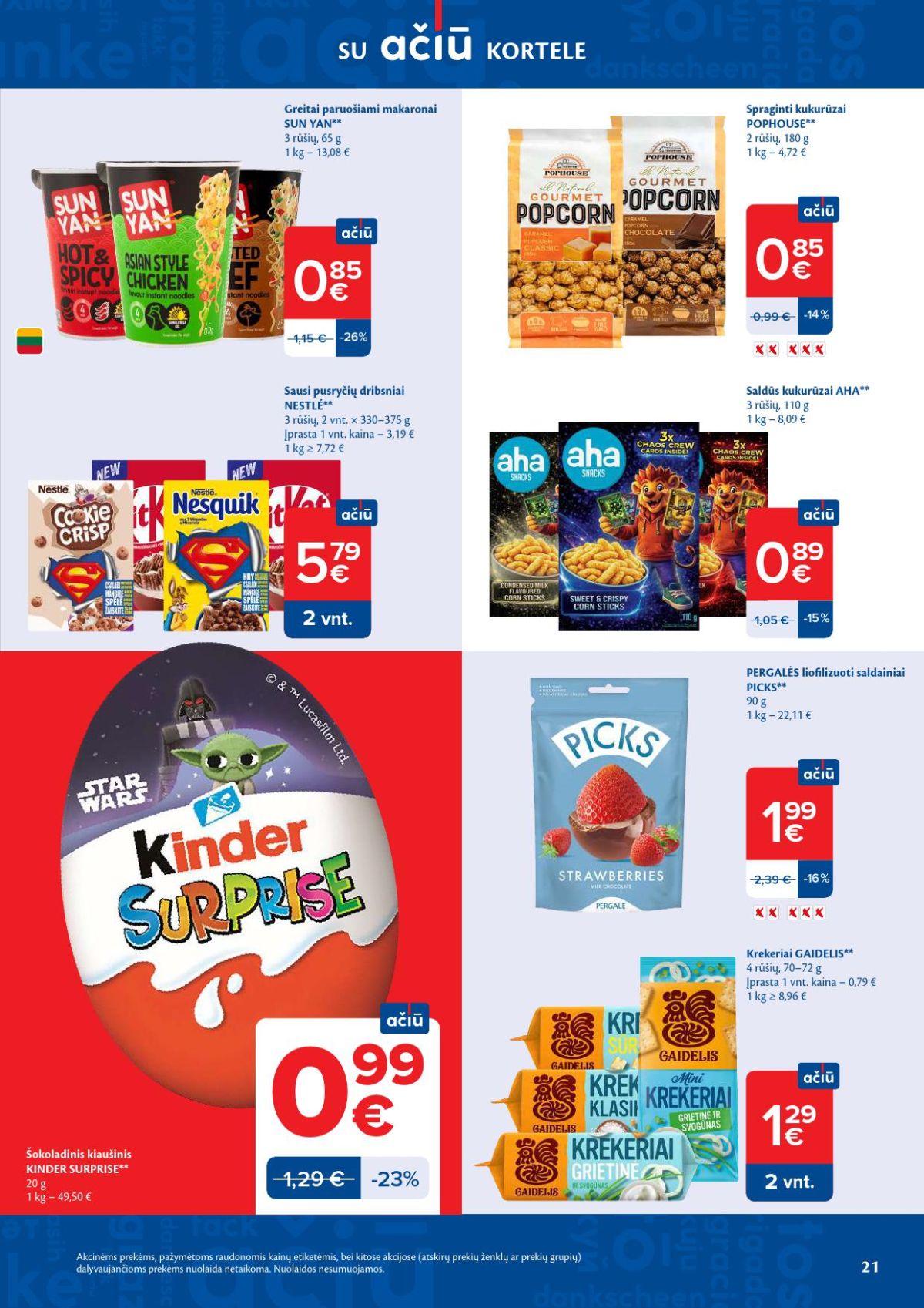 Leidinyje matomas ir aiškus Velykų laikotarpio akcentas – „Velykų mėnuo“ pasiūlymai, kurie nurodomi kaip galiojantys iki balandžio 6 d. Tarp jų – šokoladinis kiaušinis su staigmena „Kinder Surprise Maxi“ (100 g), kainuojantis 4,79 Eur. Mažesniems pirkiniams siūloma šokoladinė figūrėlė „M&M’s Crispy Bunny“ (29 g) už 0,99 Eur, taip pat guminukai-kiaušiniai „Haribo“ (160 g) už 1,99 Eur. Tokie produktai dažnai tampa greitu sprendimu, kai norisi mažos dovanėlės ar šventinio akcento vaikams.