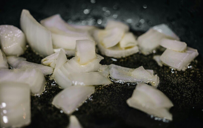 Kepkite kelias minutes, kol svogūnai taps gražios auksinės spalvos. Svarbu jų neperkepti, nes per ilgai laikomi aliejuje jie gali pernelyg patamsėti.